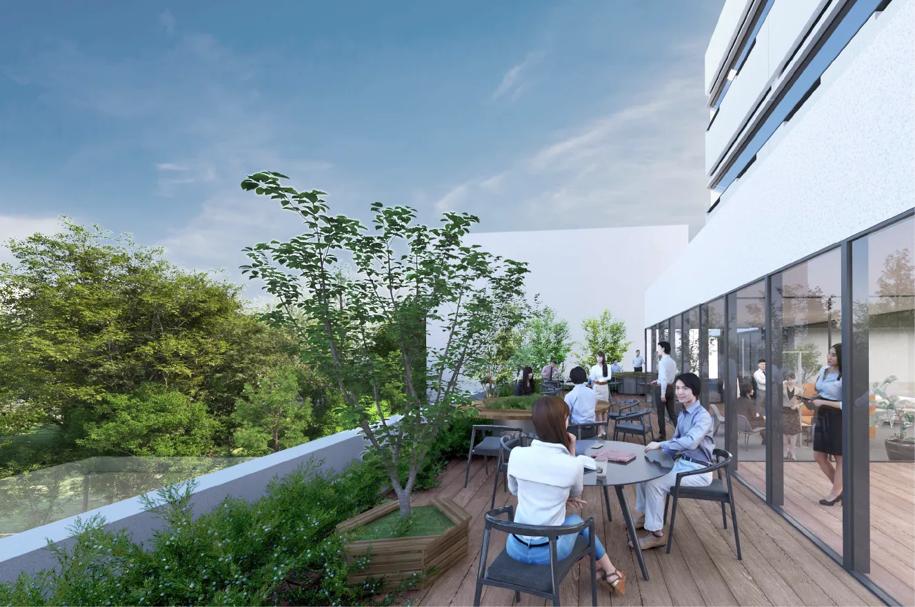 階段の積極利用を促す空間や、自然を身近に感じることで創造性を刺激する緑化テラスなど、働く人の健康、快適性向上や企業の社会的責任を果たすための先進的な機能を備えています。