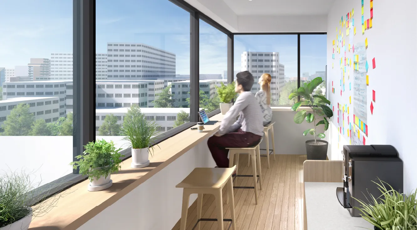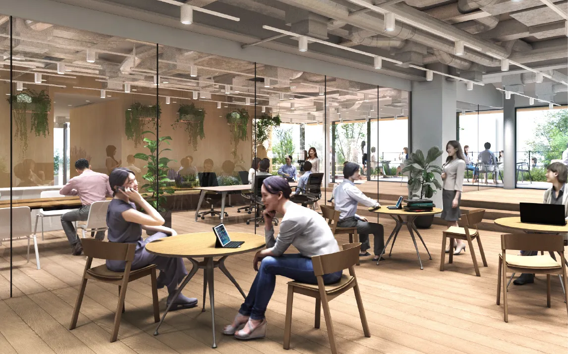 自然光が差し込む明るい共用空間や、建物内部へ人々を迎え入れ 外部に賑わいを表出する開放的なエントランス等、 入居者や利用者同士のコミュニケーション、情報共有を叶えるオフィス空間を目指します。