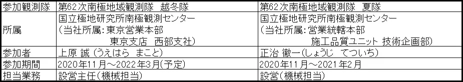 当社は、大学共同利用機関法人 情報・システム研究機構国立極地研究所より要請を受け、当社の上原 誠(44)、正治 徹一(28)を2020年7月より設営隊員(機械担当)として南極地域観測隊に派遣しております。